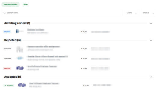 - Rejected: displays the applications that are no longer active. This may occur if you withdraw your application or if the client rejects it.