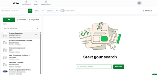On the Jobs page, you can view all the available jobs, your favorite jobs, and suggested jobs based on your profile.