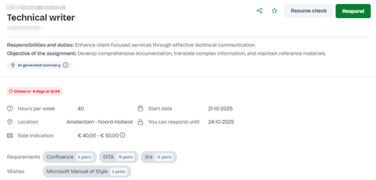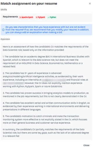 The platform compares the skills listed in the job requirements with the skills in the candidate’s competence profile and the relevance of their work experience. It then generates a summary report that displays skill matches, gaps, an overall fit assessment, and any missing technologies or areas of expertise.