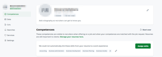 When Striive identifies skills that cannot be automatically assigned to a specific job or experience, those skills appear at the top of the profile, in the Competences section. You can manually assign these unmatched skills to the appropriate job or experience entry with just a few clicks, ensuring your profile is complete.