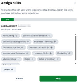 - In the Competences section, click Assign skills. The Assign skills dialog box opens.