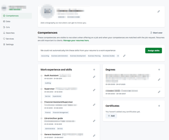 You can edit your experience, degrees and certificates at any time directly from your Competences page by updating or deleting an existing entry or adding a new one.