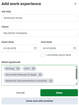 next to Work experience and skills to add a new entry. The Add work experience dialog box opens. - Enter the job title, client name, and start and end dates.
