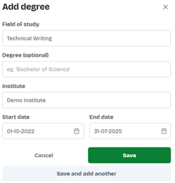 next to Degrees to add a new entry. The Add degree dialog box opens. - Enter the field of study, degree, institute, and start and end dates.