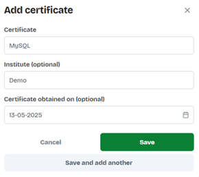 next to the certificate you want to update. The Edit certificate dialog box opens. - Edit the necessary information, such as certificate name, institute, and the date when it was obtained.
