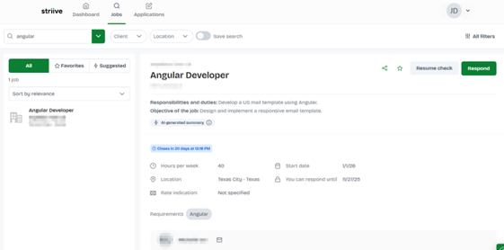 ): you meet or exceed the required years of experience. The display shows both your years of experience and the required number of years, indicating a strong match. - green check mark: if the job description does not specify the required years of experience, and you have the skill listed and unassigned, a check mark appears when you have any experience with that skill.