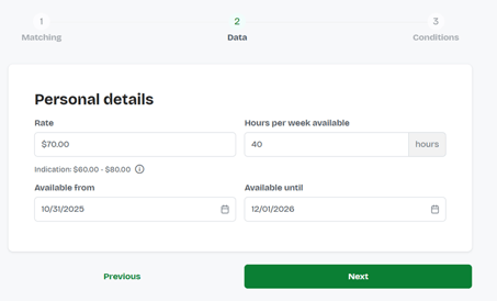 - In the Data section, enter the rate, the total available hours per week, and the availability period.