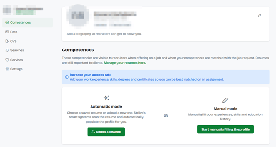 - On the Dashboard page, click Edit profile. The Competences page opens.