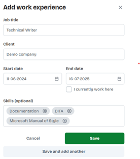 - In the Work experience and skills section, click Add. The Add work experience dialog box opens.